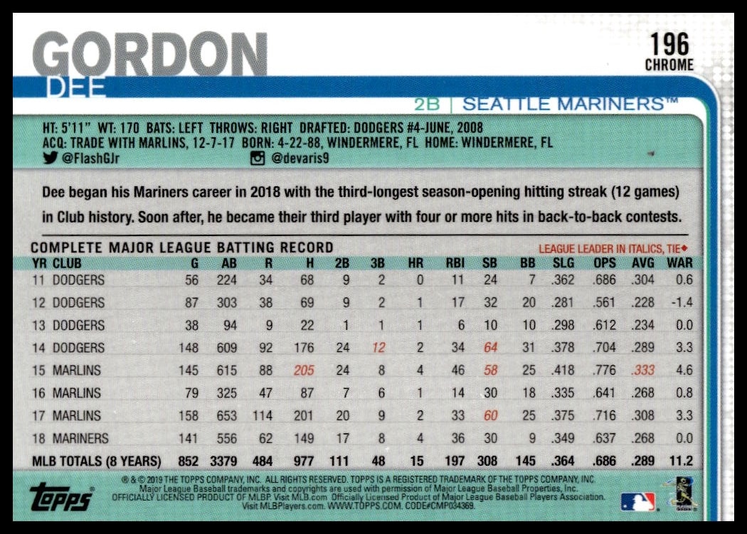 This BaseballΒ card, from 2019 is part of the Topps ChromeΒ card set. Dee Gordon is featured and has a card number of 196.