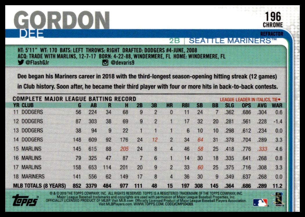 This BaseballΒ card, from 2019 is part of the Topps ChromeΒ card set. Dee Gordon is featured and has a card number of 196.