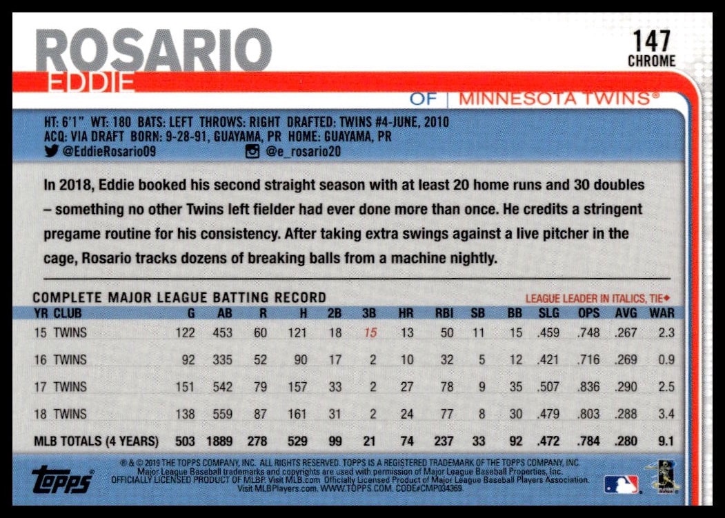 This BaseballΒ card, from 2019 is part of the Topps ChromeΒ card set. Eddie Rosario is featured and has a card number of 147.