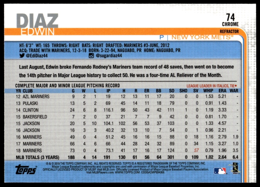 This Baseball card, from 2019 is part of the Topps Chrome card set. Edwin Diaz is featured and has a card number of 74.
