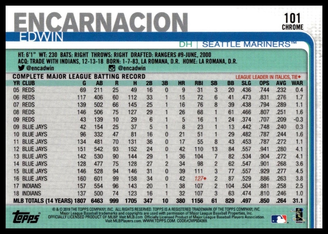 This BaseballΒ card, from 2019 is part of the Topps ChromeΒ card set. Edwin Encarnacion is featured and has a card number of 101.