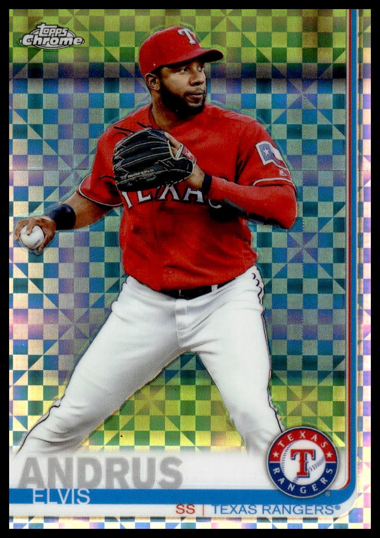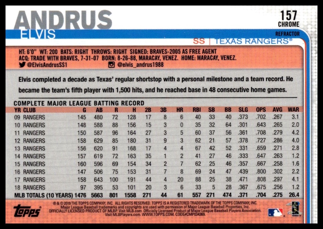 This Baseball card, from 2019 is part of the Topps Chrome card set. Elvis Andrus is featured and has a card number of 157.