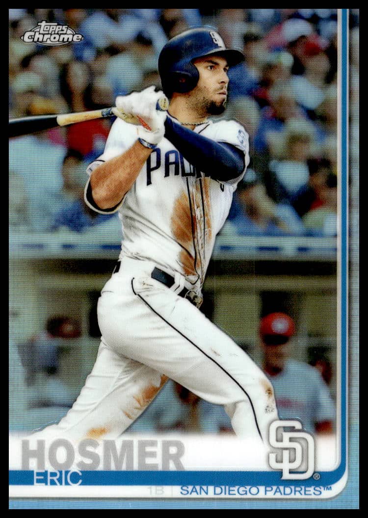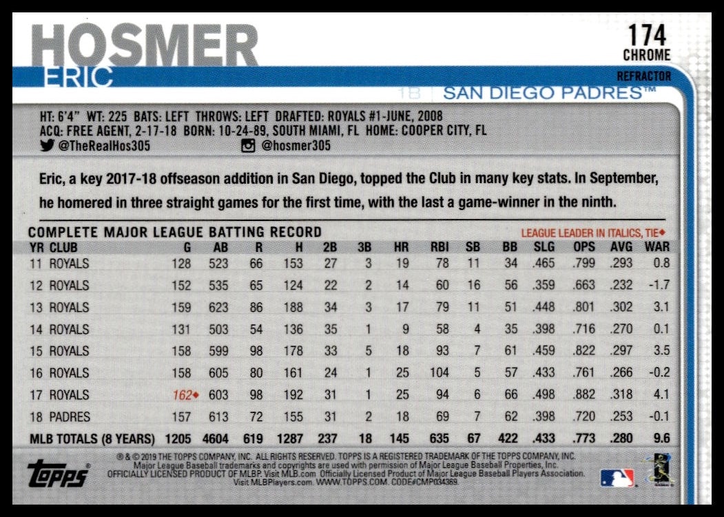 This Baseball card, from 2019 is part of the Topps Chrome card set. Eric Hosmer is featured and has a card number of 174.