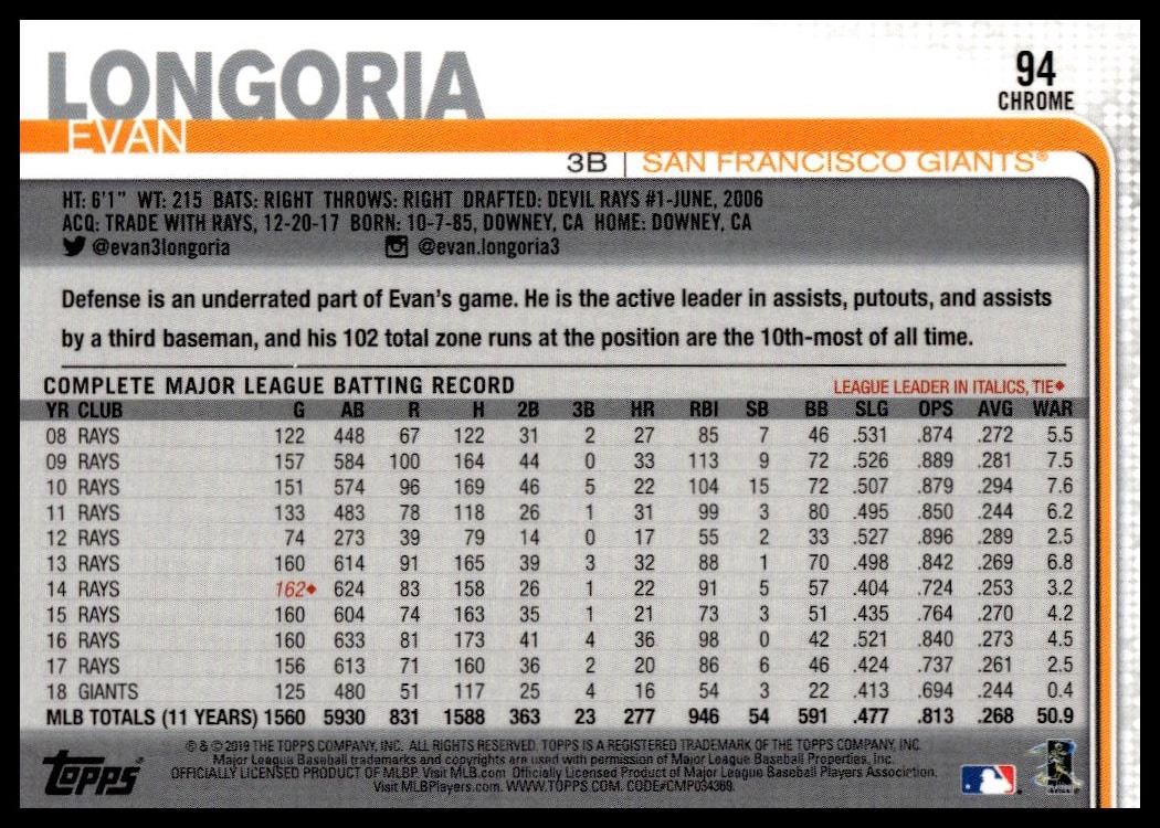 This Baseball card, from 2019 is part of the Topps Chrome card set. Evan Longoria is featured and has a card number of 94.