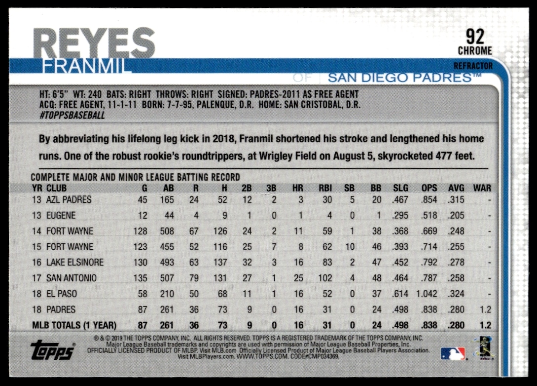 This Baseball card, from 2019 is part of the Topps Chrome card set. Franmil Reyes is featured and has a card number of 92.