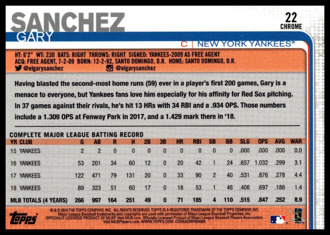 This Baseball card, from 2019 is part of the Topps Chrome card set. Gary Sanchez is featured and has a card number of 22.