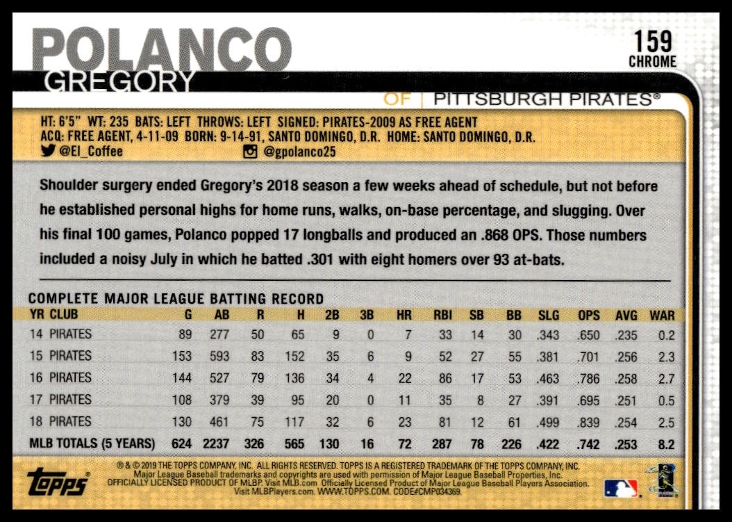 This BaseballΒ card, from 2019 is part of the Topps ChromeΒ card set. Gregory Polanco is featured and has a card number of 159.