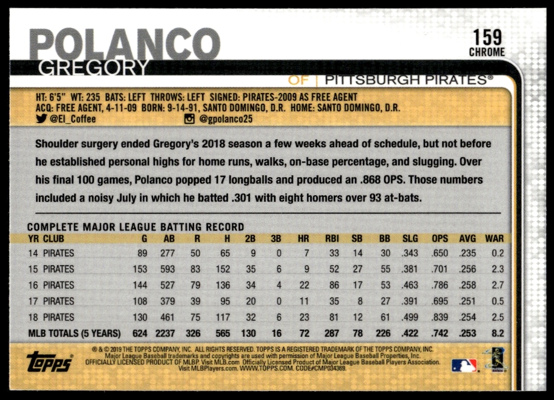 This Baseball card, from 2019 is part of the Topps Chrome card set. Gregory Polanco is featured and has a card number of 159.