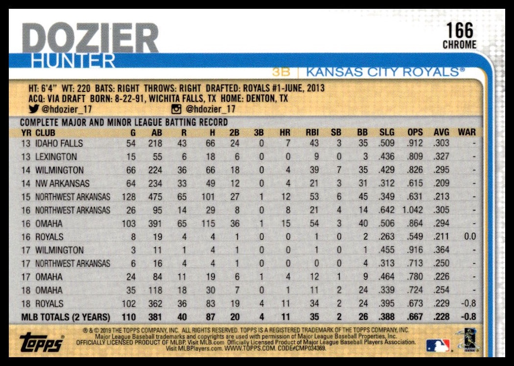 This BaseballΒ card, from 2019 is part of the Topps ChromeΒ card set. Hunter Dozier is featured and has a card number of 166.