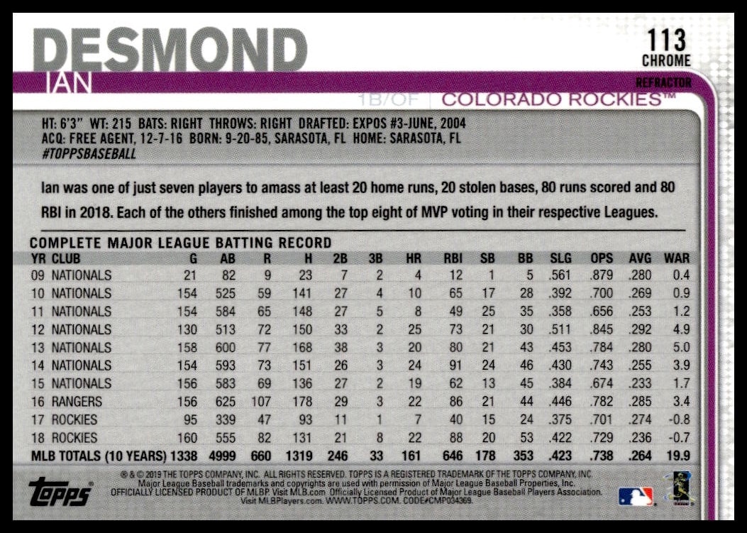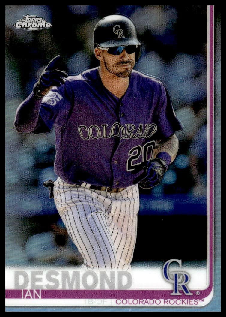 This BaseballΒ card, from 2019 is part of the Topps ChromeΒ card set. Ian Desmond is featured and has a card number of 113.