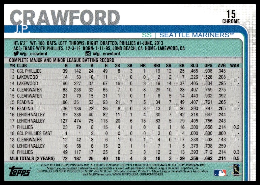 This Baseball card, from 2019 is part of the Topps Chrome card set. J.P. Crawford is featured and has a card number of 15.
