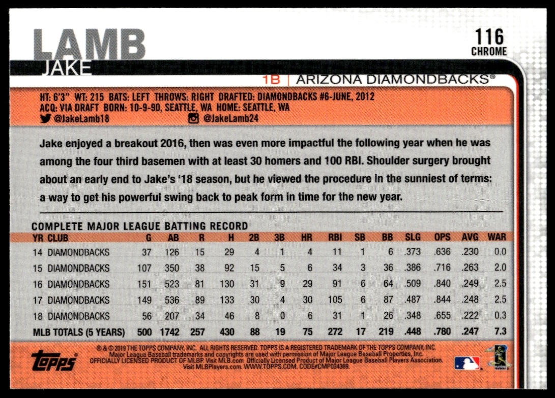 Home Β» 2019 Topps Chrome Jake Lamb Pink Refractor #334