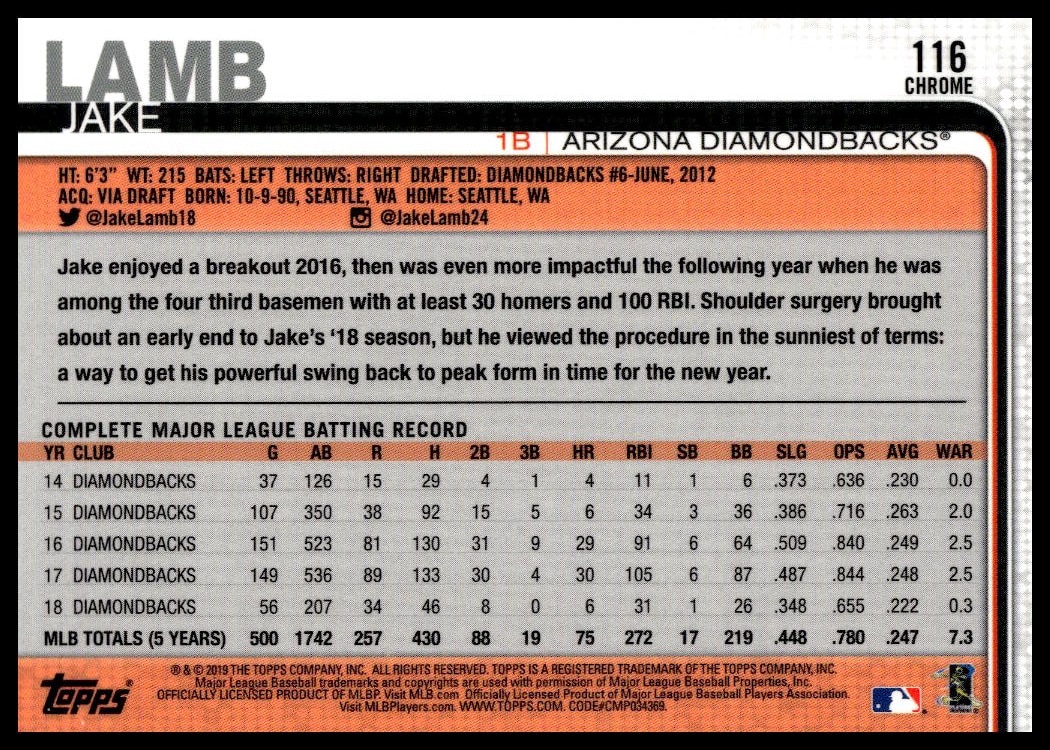 This BaseballΒ card, from 2019 is part of the Topps ChromeΒ card set. Jake Lamb is featured and has a card number of 334.