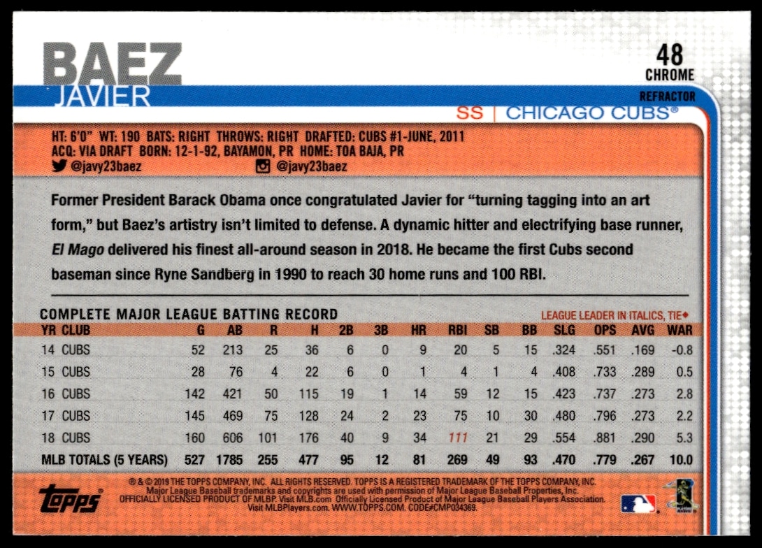 This Baseball card, from 2019 is part of the Topps Chrome card set. Javier Baez is featured and has a card number of 48.