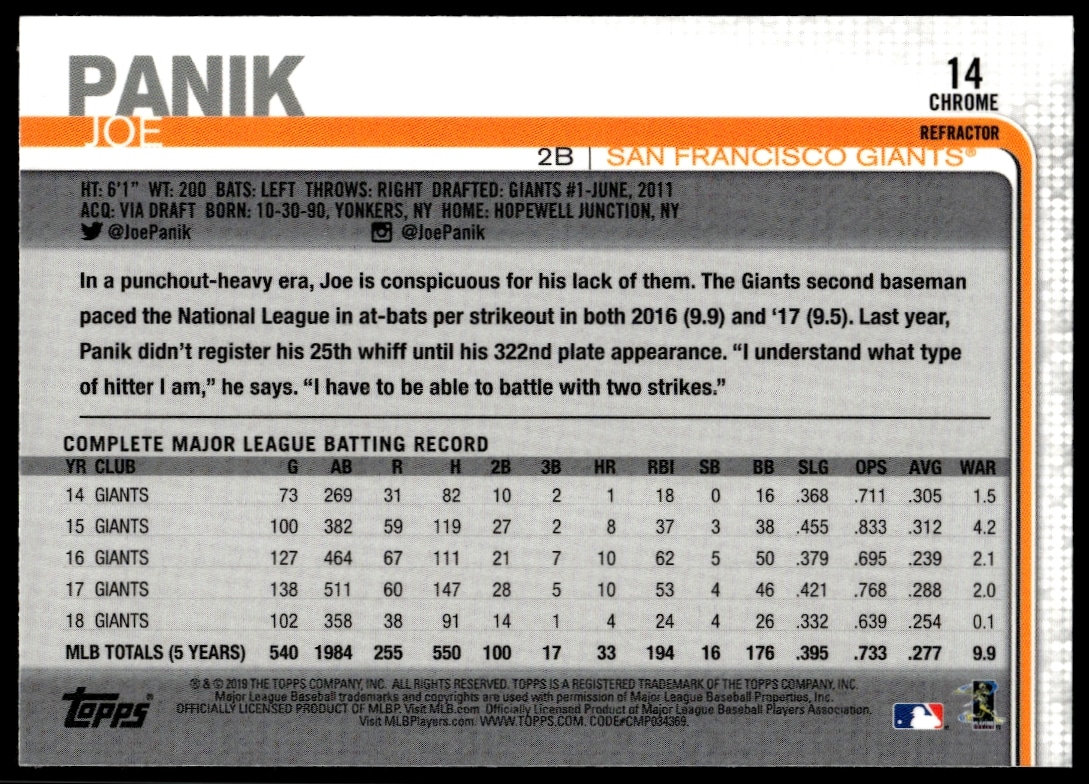 This Baseball card, from 2019 is part of the Topps Chrome card set. Joe Panik is featured and has a card number of 14.