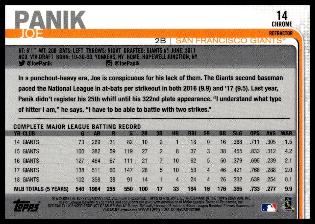 2019 Topps Chrome Joe Panik Rainbow Foil #288