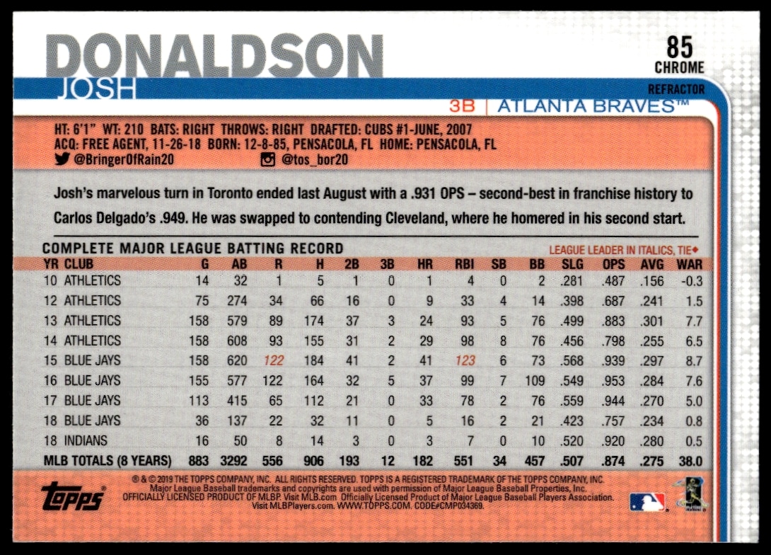 This Baseball card, from 2019 is part of the Topps Chrome card set. Josh Donaldson is featured and has a card number of 85.