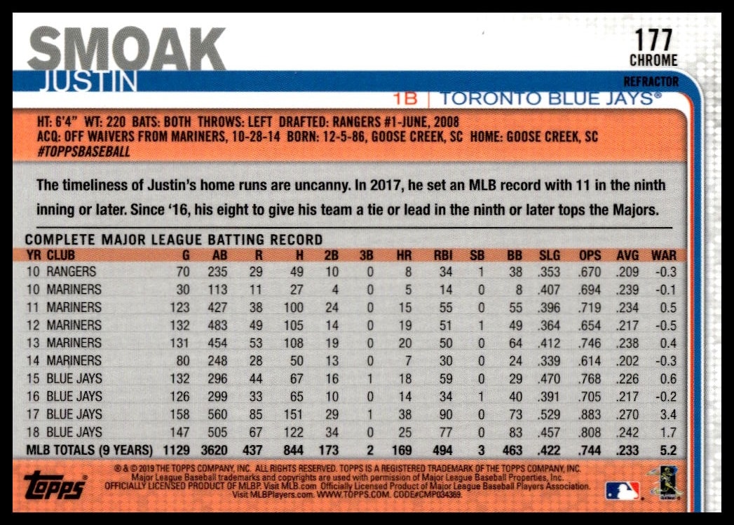 This BaseballΒ card, from 2019 is part of the Topps ChromeΒ card set. Justin Smoak is featured and has a card number of 680.
