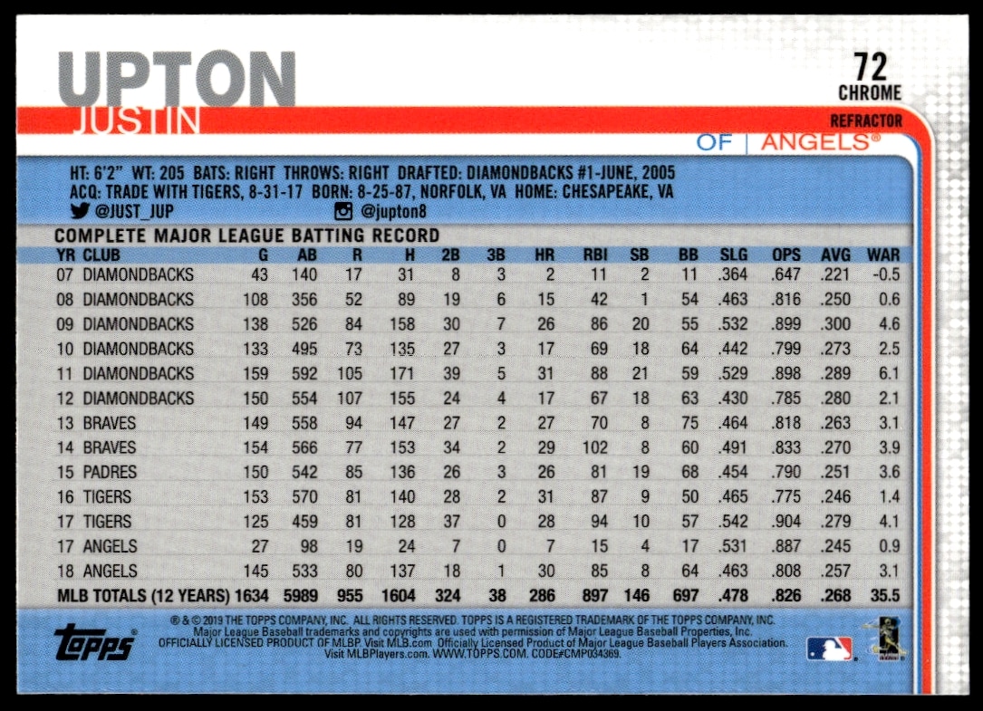 This Baseball card, from 2019 is part of the Topps Chrome card set. Justin Upton is featured and has a card number of 72.