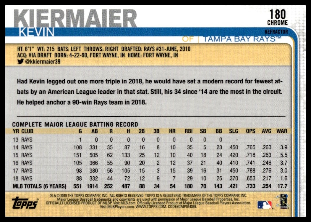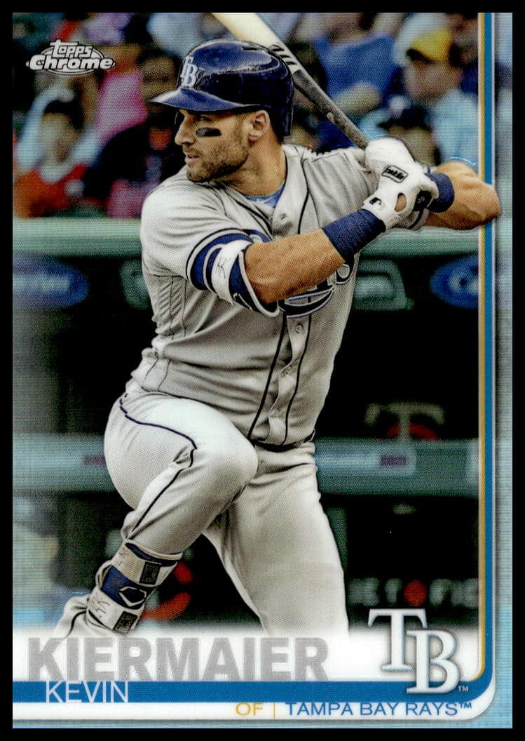 This BaseballΒ card, from 2019 is part of the Topps ChromeΒ card set. Kevin Kiermaier is featured and has a card number of 180.