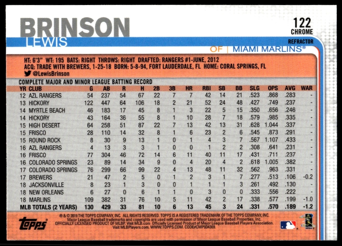 This Baseball card, from 2019 is part of the Topps Chrome card set. Lewis Brinson is featured and has a card number of 296.