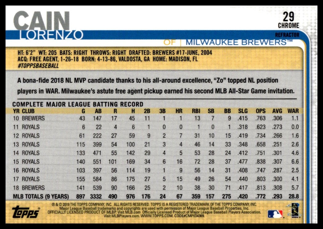 This BaseballΒ card, from 2019 is part of the Topps ChromeΒ card set. Lorenzo Cain is featured and has a card number of 29.