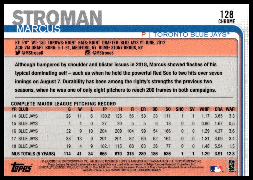 This BaseballΒ card, from 2019 is part of the Topps ChromeΒ card set. Marcus Stroman is featured and has a card number of 37.