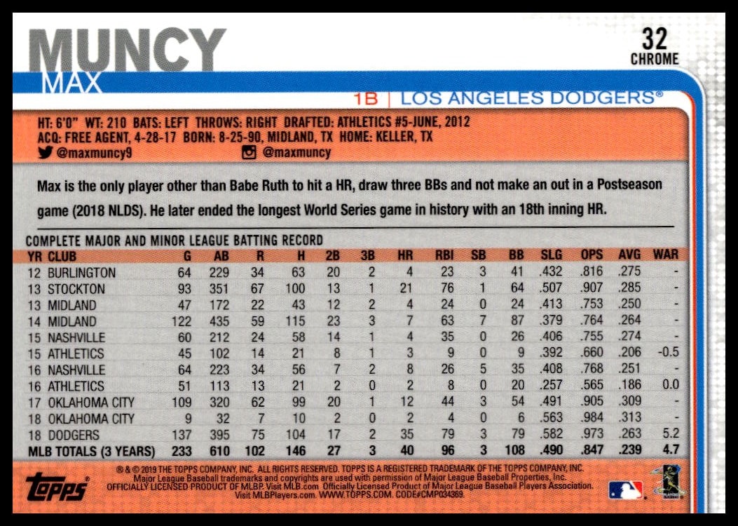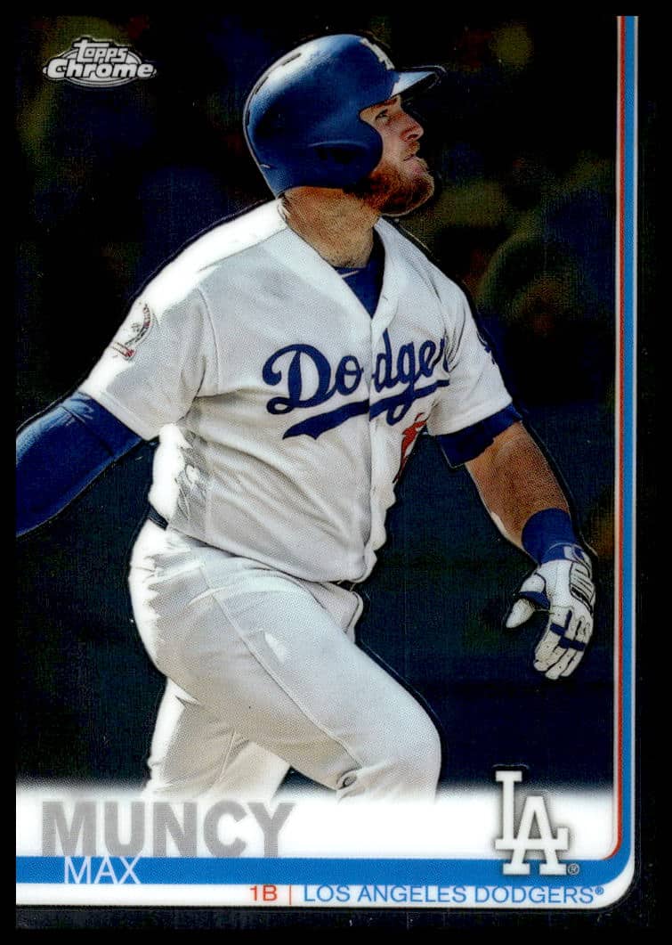 This Baseball card, from 2019 is part of the Topps Chrome card set. Max Muncy is featured and has a card number of 32.