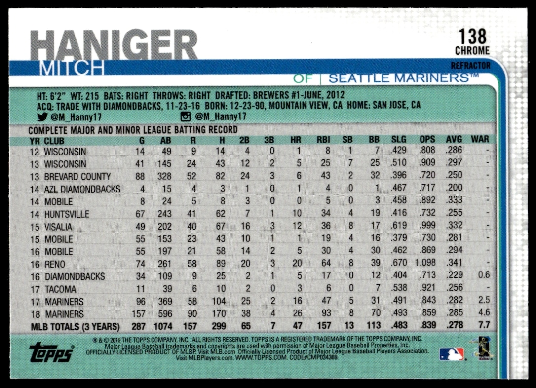 This Baseball card, from 2019 is part of the Topps Chrome card set. Mitch Haniger is featured and has a card number of 139.