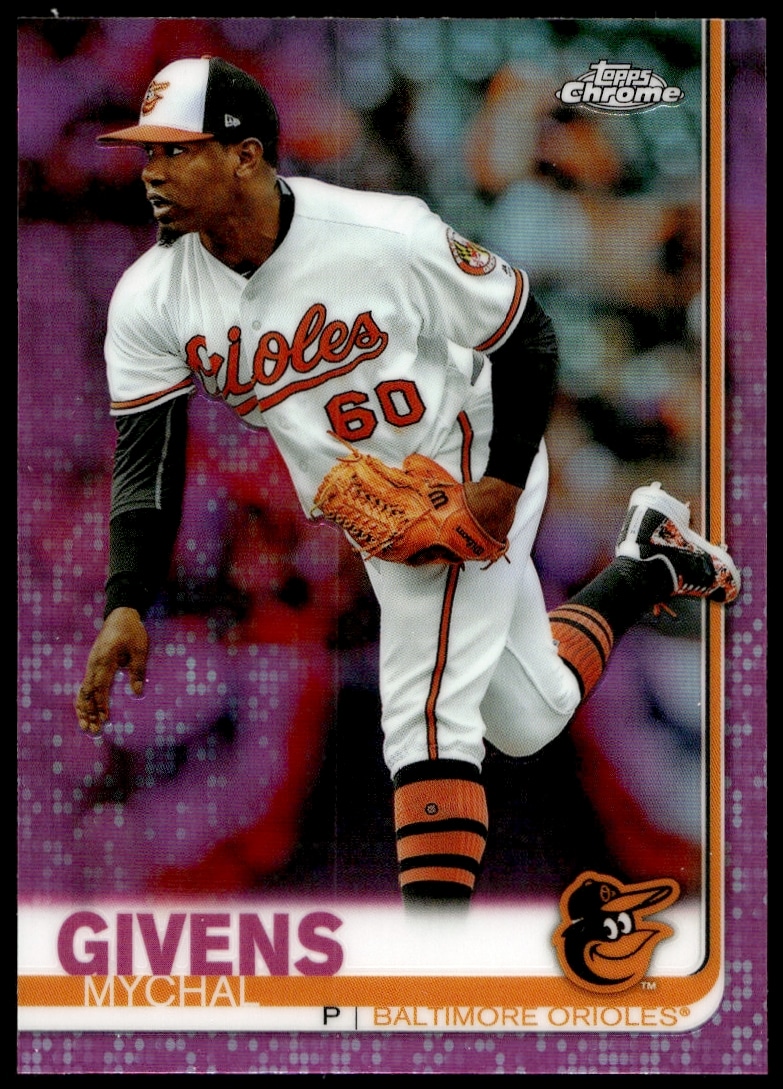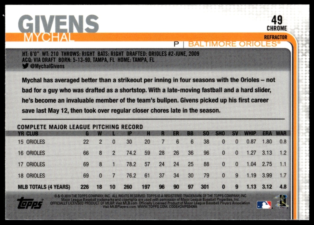 This Baseball card, from 2019 is part of the Topps Chrome card set. Mychal Givens is featured and has a card number of 49.