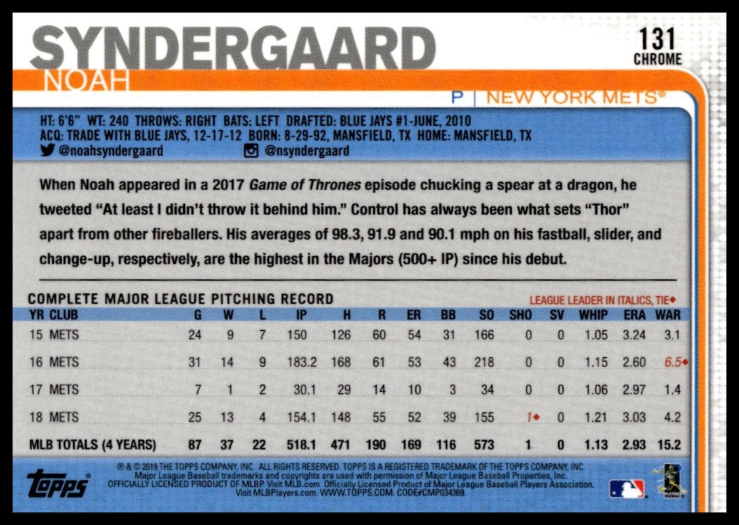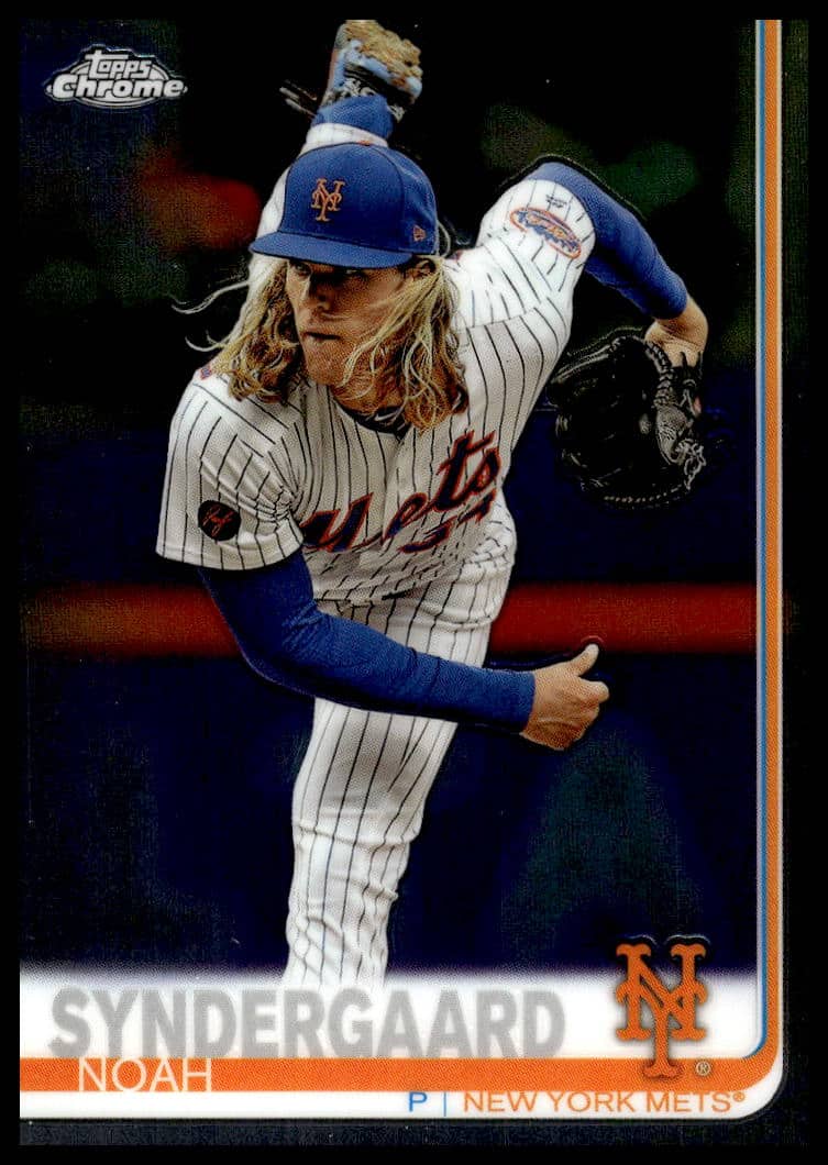 This BaseballΒ card, from 2019 is part of the Topps ChromeΒ card set. Noah Syndergaard is featured and has a card number of 131.
