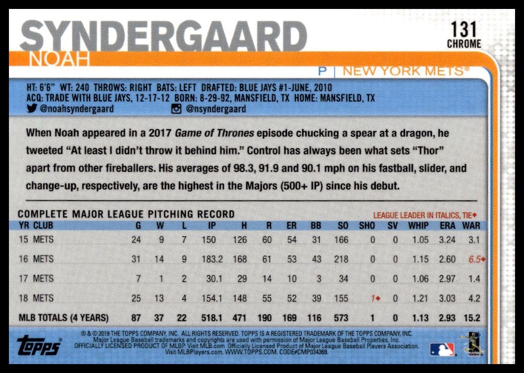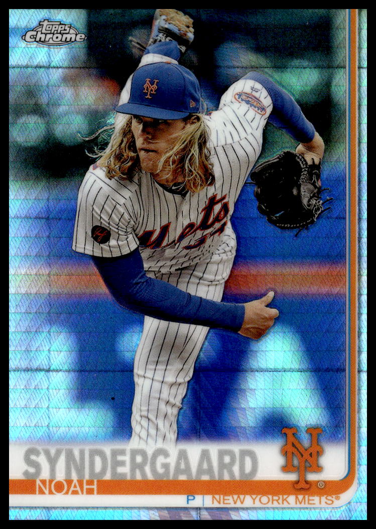 This BaseballΒ card, from 2019 is part of the Topps ChromeΒ card set. Noah Syndergaard is featured and has a card number of 126.