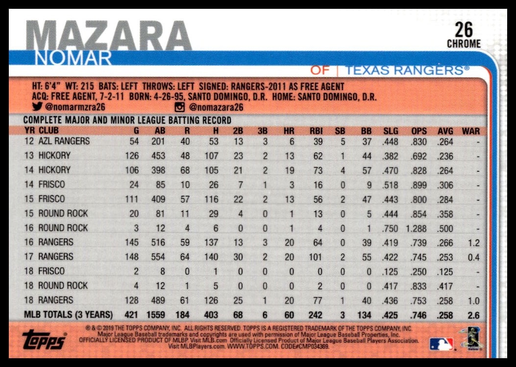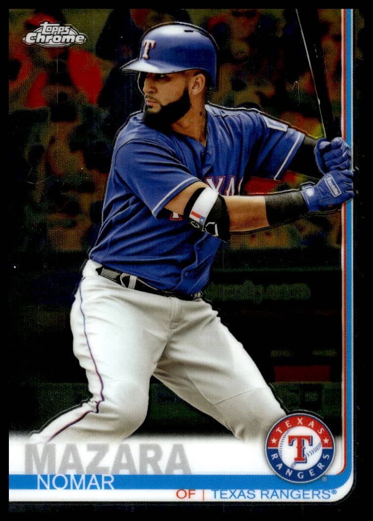 This Baseball card, from 2019 is part of the Topps Chrome card set. Nomar Mazara is featured and has a card number of 26.