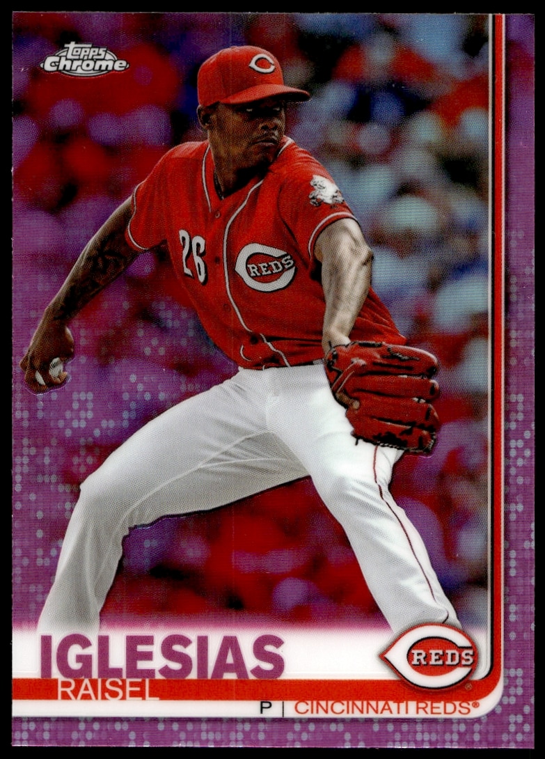 This Baseball card, from 2019 is part of the Topps Chrome card set. Raisel Iglesias is featured and has a card number of 465.