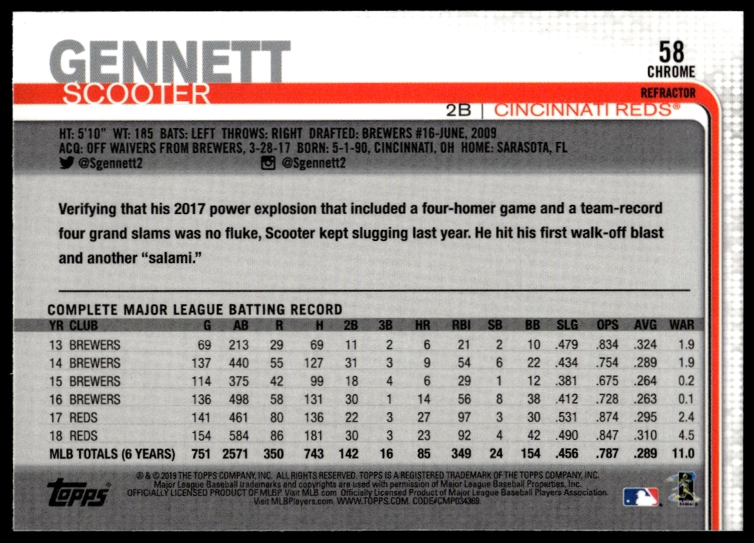 This Baseball card, from 2019 is part of the Topps Chrome card set. Scooter Gennett is featured and has a card number of 58.