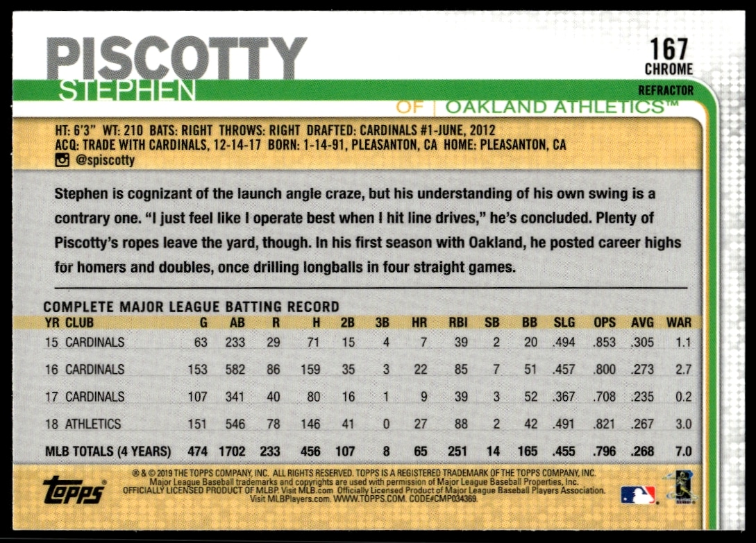 This Baseball card, from 2019 is part of the Topps Chrome card set. Stephen Piscotty is featured and has a card number of 167.