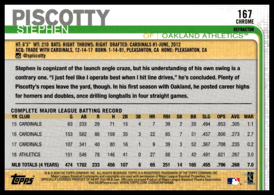 This Baseball card, from 2019 is part of the Topps Chrome card set. Stephen Piscotty is featured and has a card number of 167.