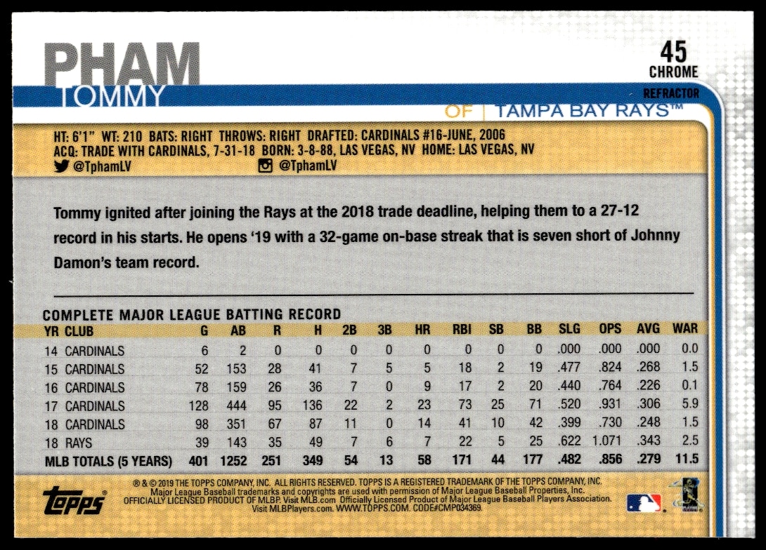 This Baseball card, from 2019 is part of the Topps Chrome card set. Tommy Pham is featured and has a card number of 45.