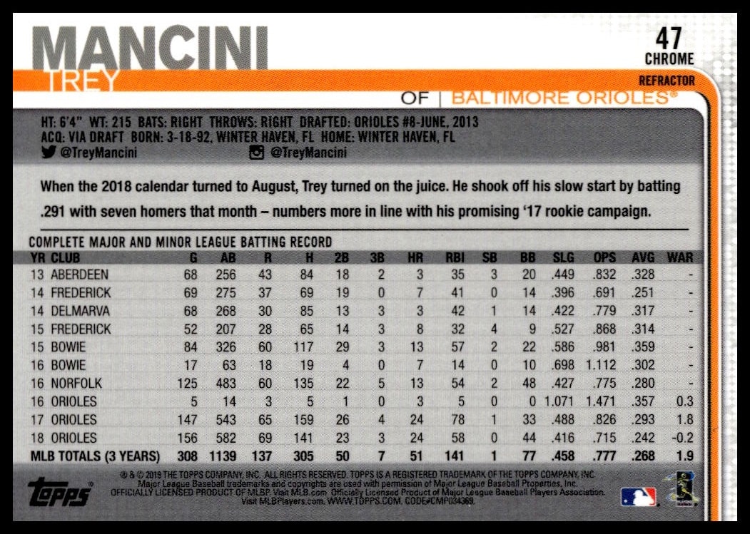This BaseballΒ card, from 2019 is part of the Topps ChromeΒ card set. Trey Mancini is featured and has a card number of 47.