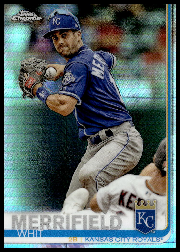 This Baseball card, from 2019 is part of the Topps Chrome card set. Whit Merrifield is featured and has a card number of 11.