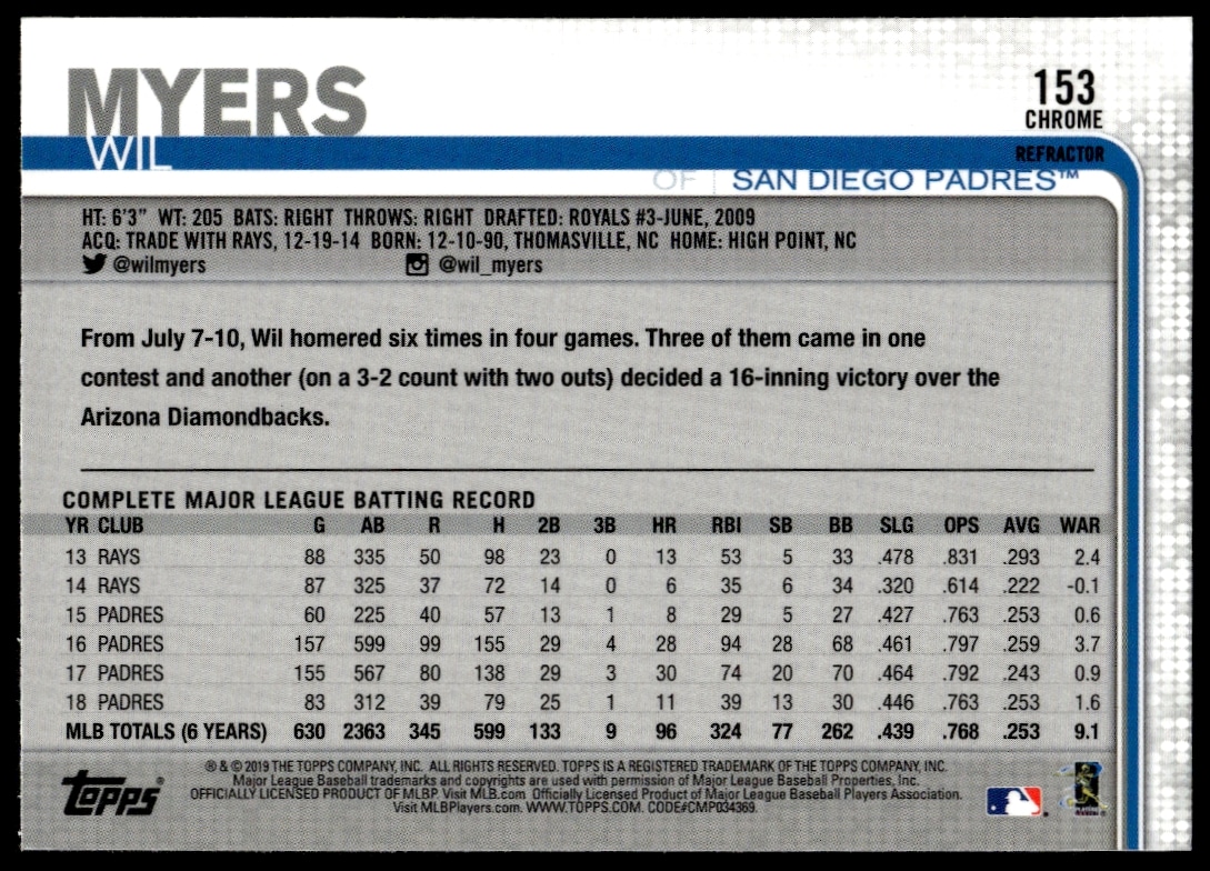 This Baseball card, from 2019 is part of the Topps Chrome card set. Wil Myers is featured and has a card number of 153.