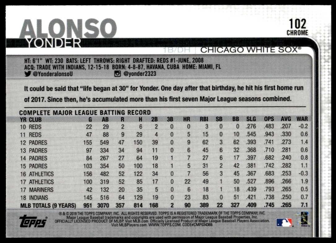 This Baseball card, from 2019 is part of the Topps Chrome card set. Yonder Alonso is featured and has a card number of 102.