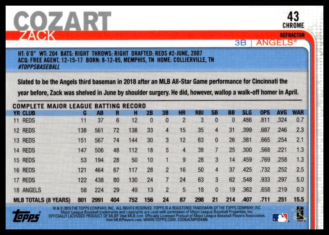 This BaseballΒ card, from 2019 is part of the Topps ChromeΒ card set. Zack Cozart is featured and has a card number of 204.
