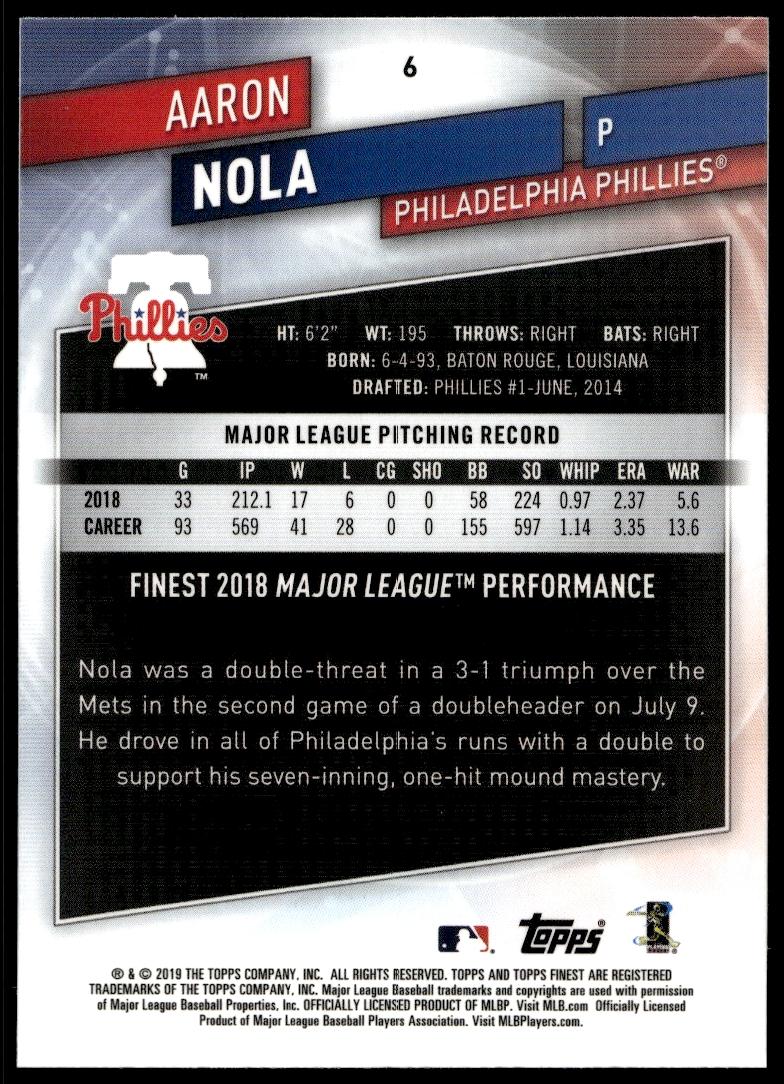 This Baseball card, from 2019 is part of the Topps Finest card set. Aaron Nola is featured and has a card number of 6.