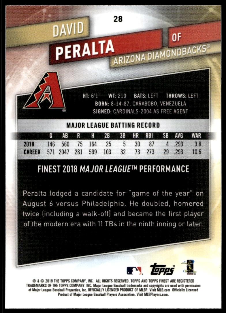 This BaseballΒ card, from 2019 is part of the Topps FinestΒ card set. David Peralta is featured and has a card number of 28.