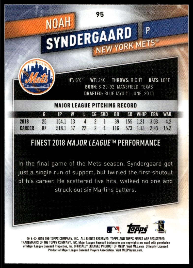This BaseballΒ card, from 2019 is part of the Topps FinestΒ card set. Noah Syndergaard is featured and has a card number of 95.