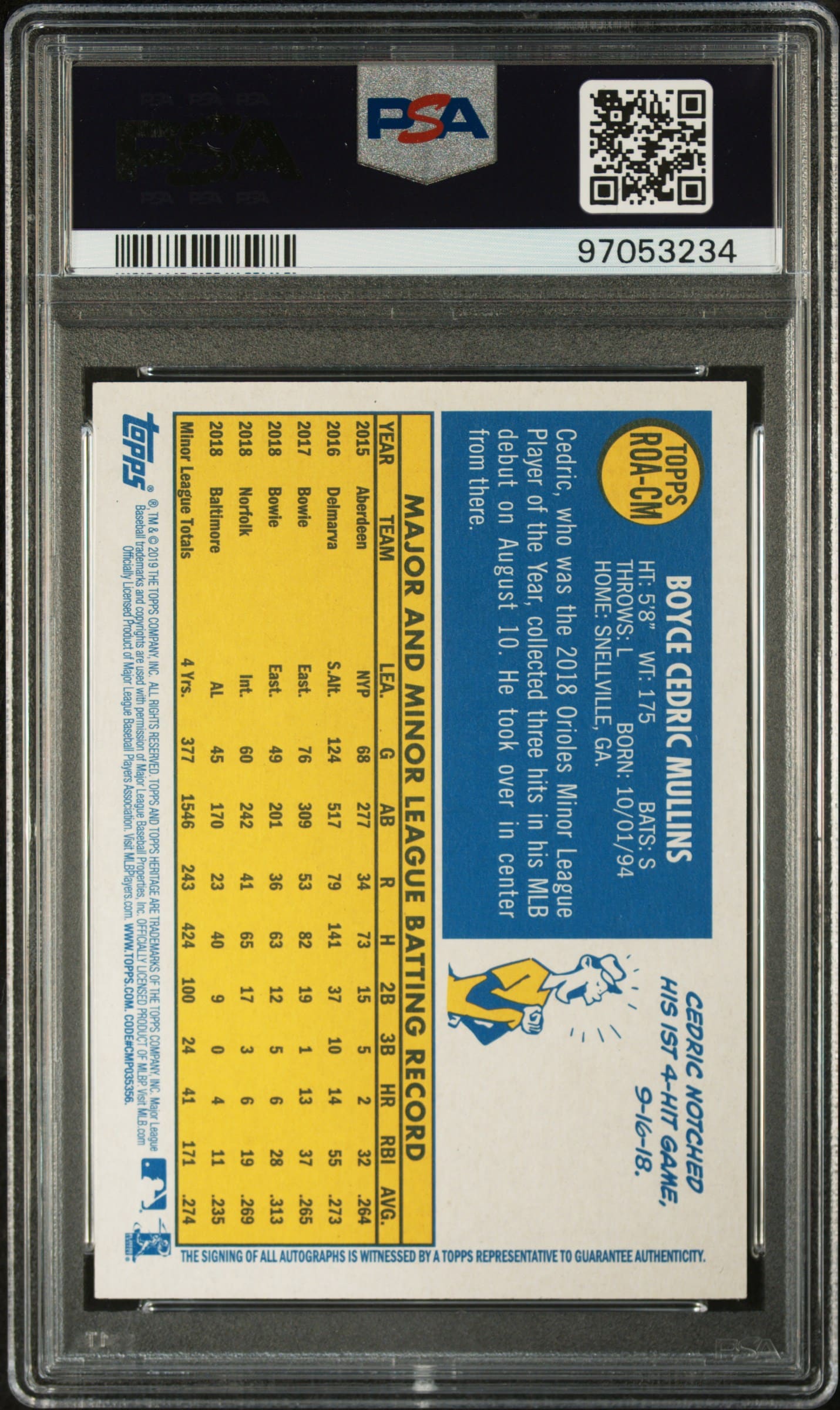 2019 Topps Heritage Cedric Mullins Real One Autographs #ROA-CM (Auto) (PSA 8)