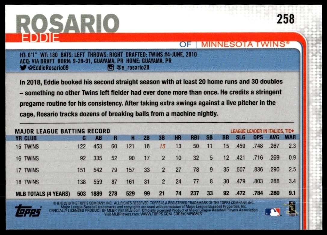 This BaseballΒ card, from 2019 is part of the Topps On Demand 3DΒ card set. Eddie Rosario is featured and has a card number of 258.