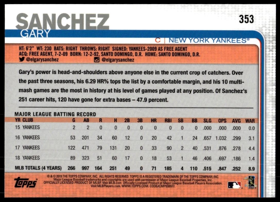 This Baseball card, from 2019 is part of the Topps On Demand 3D card set. Gary Sanchez is featured and has a card number of 353.