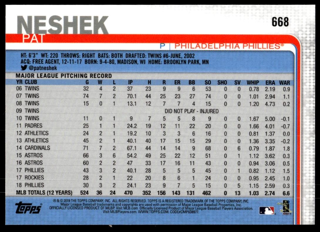 This BaseballΒ card, from 2019 is part of the Topps On Demand 3DΒ card set. Pat Neshek is featured and has a card number of 668.